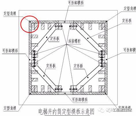 电梯井支模板技巧电梯井内筒定性模板示意图 电梯井道支模示意图 模板四角一定要牢固,这个是加了铁皮, 也可以不用 加固到位 电梯井木工操作架底盘 双钢管受力,提高安全系数。 这个可以往上升,相比通架要省事、省力 楼梯间水平施工缝不错台, 无夹渣,混凝土密实。 节点处理 柱墙阴角模板加固 螺杆距阴角<200mm, 螺杆处必须设置内撑,加固用力适当,严禁阴角模板咬肉。 柱墙阴角拆模后效果 柱墙阴角拆模后效果 柱墙阳角模板加固 柱墙阳角模板加固 对拉螺杆锁扣 柱墙阳角模板加固 模板角缝边缘混凝土浆 在每层置模前必须清理干净, 确保角缝拼装严密。 柱墙阳角拆模后效果 套模, 柱墙加固完成后应敲紧贴模,有效防止漏浆。